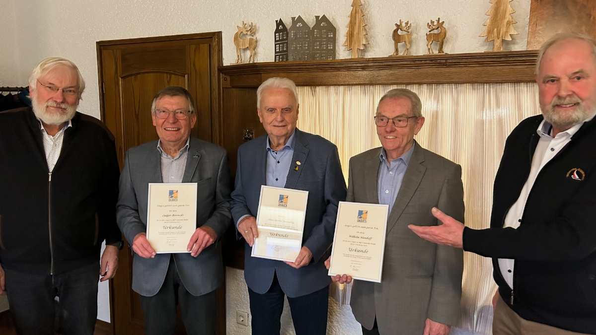 Ehrungen standen auch auf dem Programm, für 25-jährige Mitgliedschaft überreichte Robert die Urkunde an Ludger Borowski, bisher als 1. Notenwart im Amt. Für 65-jährige Mitgliedschaften erhielten Willi Nienhoff und Hans-Bernd Beumling ihre Auszeichnung.